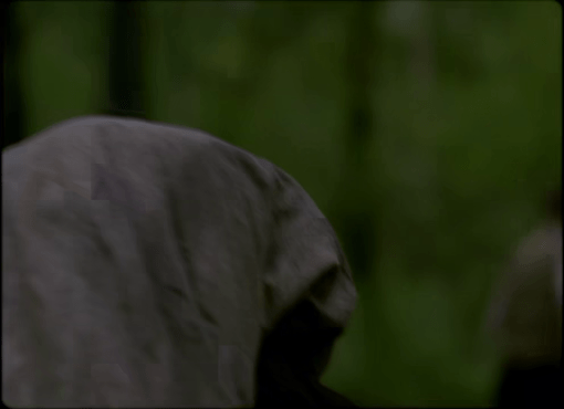 The final sequences of the film help us understand better. Saul takes part in the Sonderkommando uprising, though without fighting. He only looks to flee with “his son”—the funeral package on his shoulder (fig. 10)—and “his rabbi” beside him. He manages to enter the forest in a mad dash. He looks for a suitable spot to bury the child. He hesitates, he must give up once more. The screams of the pursuers make him change directions. He finds a piece of land near the river. Having placed his burden on the ground, in a final gesture of tenderness, he removes his jacket and folds it to make a cushion for the head of the child, still wrapped in the rag. He digs the earth desperately with a simple piece of dead wood. He orders “his rabbi” to finally recite the long-awaited kaddish. The man is silent: he doesn’t know it. He starts frenetically digging too, at least. But he flees almost instantly towards the river, like other escaped prisoners emerging from the forest.