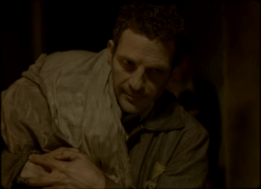 The hereafter or the bifurcation of resistance? Saul will substitute for a combat-based resistance directed towards the future (the plan to revolt and dynamite the crematory) a respect-based resistance directed towards the past (bury the body of a child like tradition demands). He’ll prefer over the society of those living, now and in the future, the genealogy of those dead, now and in the past. He’ll prefer over battle of wills (power games, strategies, winners and losers of a community in which everyone’s but “shipwrecked”) the authority of rituals (the rabbi, the kaddish, the burial by the book). Saul will carry out the missions prescribed by his comrades as scrupulously as possible, but always with his unsayable ulterior motive. But his goal is clear: “I must find a rabbi”. A strange political gesture if there ever was one. But it’s all he can answer when Abraham, his comrade, explains the “plan” for the Sonderkommando’s armed insurrection against the SS. And when Abraham tells him bitterly: “We’re going to die because of you two.”, Saul simply answers: “We are already dead.”