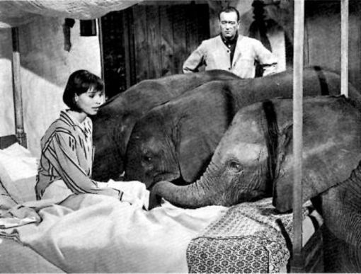 Everything proceeds by innuendo. For Feathers, the challenge is this: sheriff Wayne has told her not to wear such a sexy costume on stage. But she hopes he’ll tell her that, not as the respectful sheriff of decency and good order in town, but as a man jealous of seeing the woman he loves being sized up by voyeurs. But Wayne remains guarded, and doesn’t cross the threshold. She has to settle for his warning that, if she wears the costume, he’ll arrest her, an over-emphasis she takes for a confession. “Ï arrest you” means “I love you”. Similarly, in Hatari!, the relationship between Sean and Dallas will crystallize through an intermediary in the form of, not undergarments, but animals, and through their respective attitudes towards the baby elephants Dallas feeds.