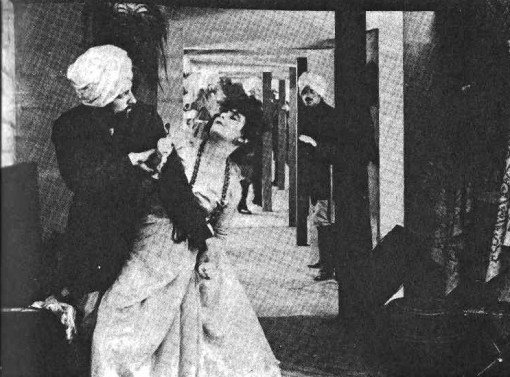 We find the theme of the seductress, who inspires in a man a love so violent that he becomes her slave, only to be totally consumed by the passion—a theme of such great consistency that it couldn’t be the doing of Fate—in Die Frau mit den Orchideen, in Pest in Florenz, where a courtesan seduces Savonarola’s disciple, and in four of the first seven films directed by Lang, Halb Blut (Half-Blood, 1919), Der Herr des Liebe (Master of Love, 1919), Harakiri (1919), where it’s inverted, and also Vier um die Frau (Four Around a Woman, 1921), where, like in Die Frau mit den Orchideen, it’s also complicated by a series of romantic rivalries.