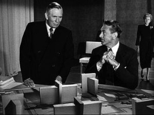 Unlike Dominique’s or Toohey’s, Gail Wynand’s dichotomy is not a fundamental dichotomy. It is circumstantial. While Toohey doesn’t change one bit during the course of the film, Wynand takes opposite routes one after the other, owing to his commercial tactics. He exhibits five attitudes in all towards Roark: at first indifferent, he then campaigns against him, simply to get a better circulation of his newspaper, a Yankee Minute. He then defends him to please Dominique, before redoubling his attacks once he loses readers, and finally placing an order for the Wynand building, his opportunistic impulses now going against the tide. This reminds us of other news executives such as Jean-Jacques Servan-Schreiber (one move to the right, one move to the left) or André Parinaud of Arts who had given carte blanche to those of the Nouvelle Vague before opening the columns of his weekly magazine to its haters alone. One may also think of Georges de Beauregard who produced Rozier, Varda, Rivette, Demy and Godard, then devoted himself to the works of Grangier, Marcel Camus and De La Patellière. Or of politicians such as Talleyrand or Bayrou.