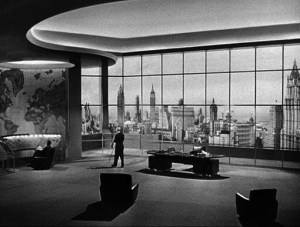 The visuals rely on the construction of a complex studio set, complemented by models of New York skyscrapers in the background. As a result, in a setting such as that of the newsroom of The Banner, one can see both banal modern architecture on the outside and futuristic kitsch inside, as Lorenzo Codelli rightly says in Positif [1], with a gigantic world map, in front of which the newspaper’s employees move about in all directions, under the dominating eyes of Wynand on his revolving chair. These permanent backdrops highlight Wynand’s pretensions, his power and also the vanity of that power in the face of the world as a whole, before which journalistic quarrels seem futile and mediocre.