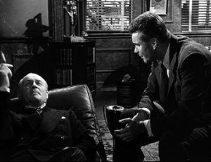 In order to vary this, he proliferates the changes in actor position in the shot. A discussion around architectural strategy begins with Toohey lying down, before he straightens up. Sometimes, when she disagrees with her interlocutor, Dominique looks alternately at her interlocutor and at us or into the distance, glimpsing only a distant ideal.