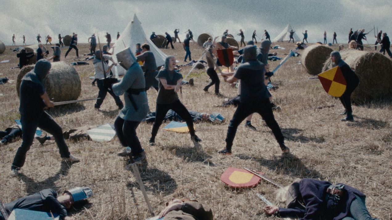 The horrors of the world are scarcely to be seen in Matter of Britain too. Peter Treherne’s enigmatic, rapturously shot debut feature unfolds in an unnamed, lushly wooded village in the south of England. Vignettes from everyday life in the village – farming, deer hunting, sheep rearing, churchgoing, cattle trading — are interspersed with fictional passages in which the villagers enact episodes from Arthurian legend, particularly the Knights’ quest for the Holy Grail, in full costume. Realized in a high-theatrical style, and bathed in Caravaggian darkness, these passages monumentalize ordinary lives in a manner that recalls Roberto Minervini’s use of rural Southerners in The Damned (2024). Treherne’s film doesn’t expound on this strange mix of fantasy and ethnographic document, although an early radio soundbite about climate change-induced agrarian crisis hints at a possible connection to the Holy Grail’s capacity to restore barren lands. Does the Quest represent a living myth for the villagers, a collective, subconscious yearning? Are they looking for some kind of deliverance? Matter of Britain doesn’t explain.