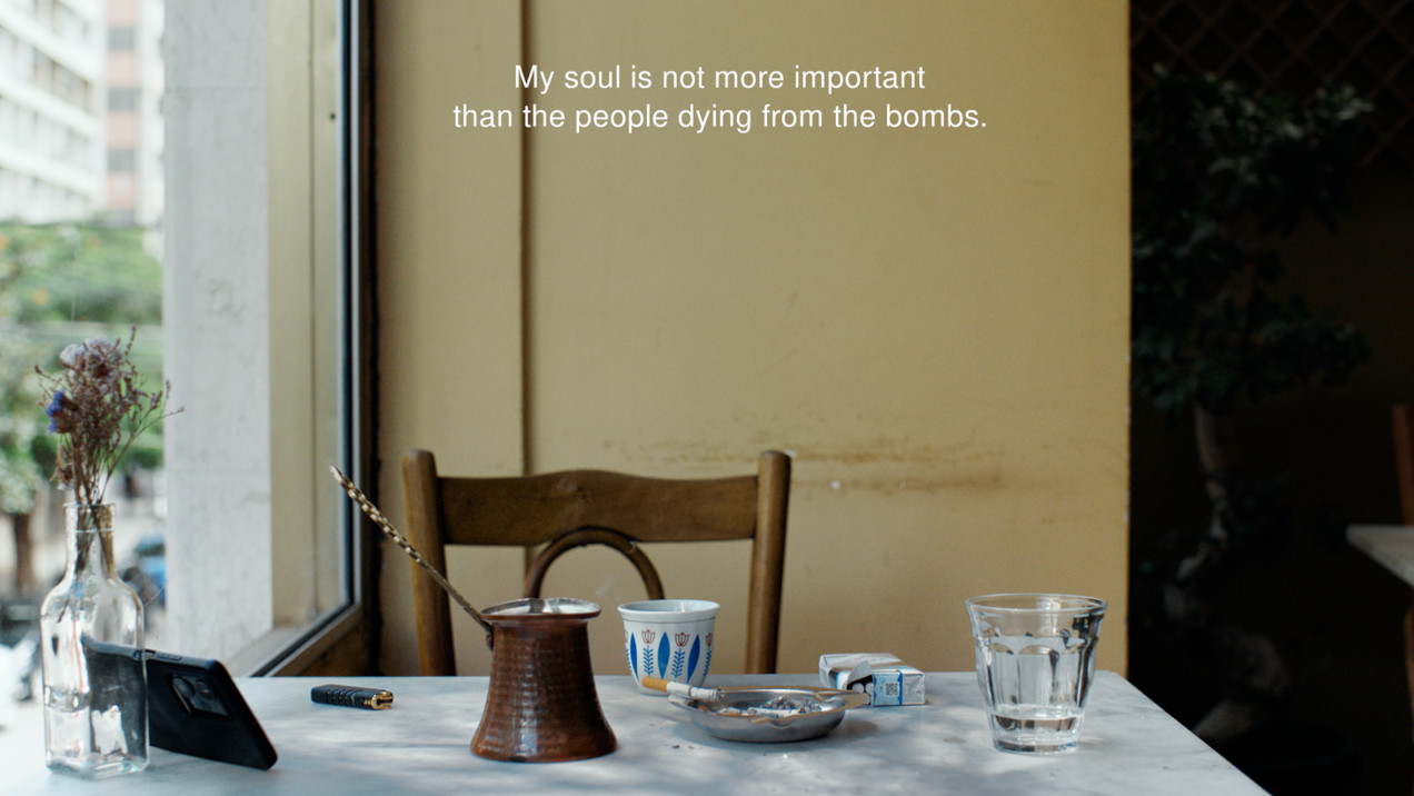 Issa’s refusal to take up pointless roles to sustain a career, to maintain a screen presence while censoring her critical voice, is echoed by Subrin’s refusal to show her. “If I’m on screen I’m something, and if I’m not I’m nothing? Khalas?” asks the actress, adding that she feels punished for her political opinions, for calling out Israel’s bombing of Gaza. “If I can’t be true to myself, there is no point showing myself,” Issa concludes, as the camera gently pans from the table to a street outside the window. Like Schneider’s, Issa’s self-negation stems from an outlook that privileges life over films, reality over fiction. Six hours after the filming, an end card notes, “Israeli airstrikes escalated throughout Lebanon, killing over 500 people in one day.”