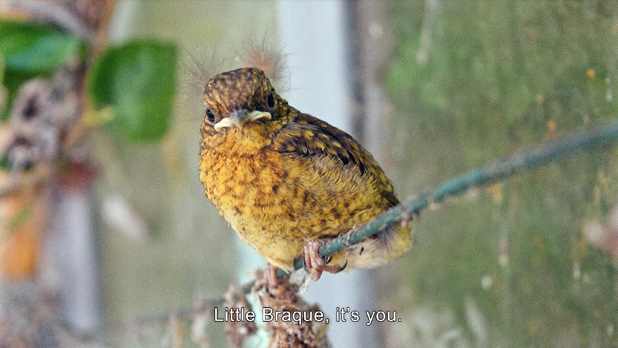 Consider, for instance, Look Through My Eyes and Give Me Your Own. Noëlle Pujol’s half-hour documentary features the filmmaker walking through Cubist pioneer Georges Braque’s studio in Varengeville-sur-Mer, Northern France. For the most part, the camera surveys the now abandoned structure, taken over by nature, and the vestiges of human culture still visible on its walls. Recalling Picasso’s aphorism “I don’t search, I find”, Pujol’s casual, liberatingly purposeless gaze roves about before resting on a small, exotic bird perched on a wire inside the studio. Unfazed by the intruder, the gorgeous little creature stares back at the camera, which resumes its aimless drift after this uncanny encounter.