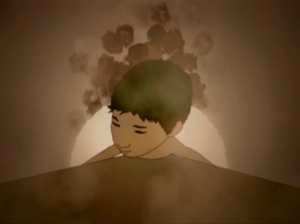 A more traditional style, closer to commercial Japanese animation, marks the three-episode Japanese Kitchen, which presents sketches of a housewife trying to imitate recipes shown on daytime television. The manner in which the banality of the situation is superimposed over chilling body horror – beating small men and women in a mixer to produce babies, deep frying the male brain and seeds that have people crawling out when soaked in water – betrays a trace of populist horror cinema, television and literature. Tabaimo’s tongue-in-cheek triptych – commissioned for television whose audience is the very subjects of her film – proposes tantalizingly easy and morbidly humorous solutions to the demographic problems of Japan.