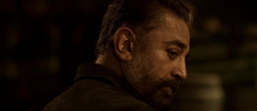 A man in a sleeveless vest is bleeding from his eyebrow, arms raised. A hand from outside the frame grabs him by the hair and turns his face upward towards the light. A towering figure appears between the man’s face and his raised left arm, putting its arms around the man and pressing his chest with a baton. The camera pulls back to reveal the setting; the room is sparsely furnished. The hand belongs to a constable in uniform, the tall figure is a police officer (Pradeep Shakti) and the man receiving the blows is Velu (Kamal Haasan, an actor who loves to get hurt even when he is the aggressor). The inspector is wearing an undershirt too, one with sleeves, which serves a practical purpose (hitting someone is an arduous, sweat-inducing task) as well as a symbolic one (he is acting only partially in his official role). He has picked up Velu for defying him and, with the zooming camera now outside the room, he strikes his victim from behind with all his might.