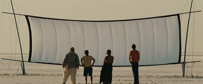 Road, Movie (2009), written and directed by Dev Benegal, follows Vishnu (played by middle cinema darling Abhay Deol), the son of a small time hair oil seller, who borrows an ancient Chevrolet truck from his neighbour and hits the road on the pretext of selling his father’s stock and delivering the truck to its proper destination. Little does he care that the truck doubles as mobile cinema. On his way, he encounters a village in dire need of water where a dacoit group has been terrorizing the villagers, appropriating the available water, bottling it and selling it back to them. A paean to popular cinema of yesteryear, specifically to those times when films used to be a collective social experience that transcended class, race, gender and other disparities, Road, Movie views (and literalizes, as in the carnival segment) cinema, in the Bazinian sense, as a collective dream that acts as a fulfillment ground for our real life desires. Consequently, it laments the death of that collective experience due to corporatization of film production and segmentation of potential markets*. Through plot details, bizarrely enough, it equates cinema to both water (suggesting that both are essentially public commodities unjustly being appropriated for the benefit of a few) and oil (in that both are ultimate stress-busters and great social levelers, as is pointed out in the recurring song borrowed from Guru Dutt’s Pyaasa (1957)). Road, Movie is also self-consciously generic, as its title points out, likening the journey on a road to the trajectory and experience of a movie. True to the conventions of its genre, the individualistic, petit bourgeois protagonist realizes the meaning and importance of living in a community and, among other bromides, that the journey is more important than destination. But then, Benegal also keeps deviating from the genre in that he avoids conjuring up a revolutionary hero out of Vishnu. He may mean good, he might have learned a few important lessons, but he’s as helpless in front of these social forces as he was at the beginning. He can do nothing but go back to his dreary middle class existence. Oh well, at least there’s Tel Malish.